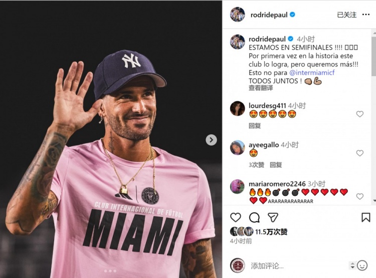德保羅此役為邁阿密國(guó)際踢滿全場(chǎng),賽后他在社交媒體上曬照慶祝晉級(jí),配文:“我們晉級(jí)東區(qū)半決賽!俱樂(lè)部歷史上首次達(dá)成此成就,但我們志在更遠(yuǎn)!征程永不止步,邁阿密國(guó)際眾志成城!”